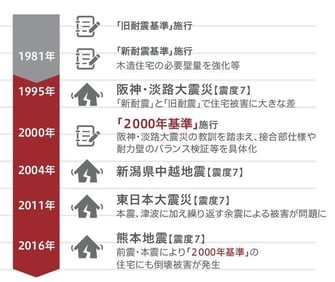 1995年に阪神・淡路大震災が発生し、同様の地震が来ても命を守れるように2000年に建築基準法が改正され、耐震基準の強化が行われました。